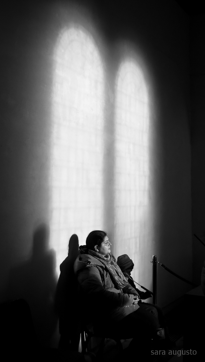 A verdade é que aquele não era o castelo que eu queria ver. Não tinha musgo dourado nas ameias, nem as paredes eram de pedra crua e fria, alcandoradas em rochas com giestas e mimosas. Suponho que ela pensasse o mesmo ou outra coisa à sua medida igualmente menos favorável. Quando entrou, comigo atrás dela, olhou em volta e sentou-se. Puxou o filho para o seu lado, e ficou quieta enquanto o guia explicava a história da capela real do castelo de Stirling. Li o flyer e também esperei, sem vontade de fotografar o que quer que fosse e com uma vontade imensa de sair dali. Mas ela… ela estava no sítio certo, com a luz certa e eu estava miraculosamente atenta – sobre a minha crónica falta de atenção tenho de escrever outro dia.