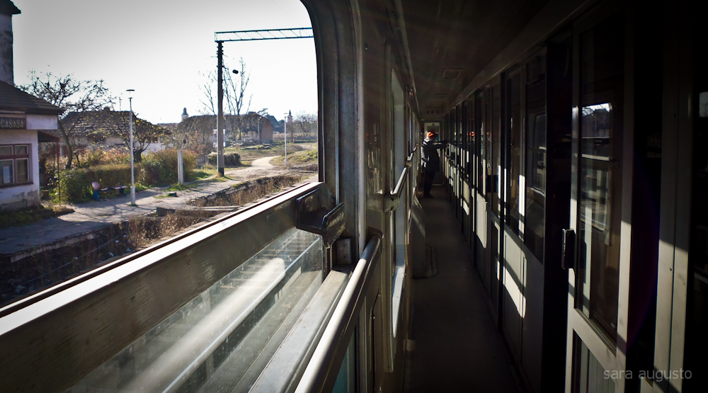 Enfim, escrevi pouco, não li nada, nem o romance nem o artigo. Passei horas no corredor, à janela, a lamentar cada fotografia tremelicada que saía da minha maquininha de viagens. E atravessei a Transilvânia, campos e campos a perder de vista, aldeias todas iguaizinhas, campanários no meio de cada uma, animais, carroças, picotas e rebanhos, fábricas abandonadas, edifícios como fantasmas, tudo a passar à minha frente a uma velocidade vagarosa e envelhecida. Devo ter ouvido histórias fantásticas em romeno… Havia um senhor com uns olhos azuis tão brilhantes que eu me forcei a desviar o olhar deles. Instalou-se comigo à janela e, como eu acenava e sorria a cada entoação dele, conversou muito tempo, apontando para os campos que atravessávamos. Depois dividiu comigo um bolo doce e quando saiu, muitas horas antes de mim, veio despedir-se. Voltei ao compartimento. Ia por lá uma conversa animada e não pararam por minha causa. Percebi que eu era o tema da conversa quando vi o Saramago nas mãos da senhora elegante. Devem-me ter perguntado coisas… pensei que queriam saber de mim e contei-lhes das minhas viagens, do meu trabalho, da minha vida, da minha família, das mensagens que trocava por telemóvel e que me faziam sorrir e chorar ao mesmo tempo… ouviram-me silenciosamente até eu para de falar e beber uma garrafa de água. Ri-me e abanei a cabeça, avaliando a minha tontice e a deles. Comentaram uns com os outros e acabaram por se rir comigo… ou de mim, mas era o mesmo. E depois dei-lhes dos meus pretzels salgados e com sementes e comi das maçãs do casal da janela. Várias vezes se juntaram a mim na janela do corredor, a minha vista preferida para a Transilvânia. Escrevi um agradecimento nas costas de um postal do castelo de Bran, coloquei-o dentro das Intermitências da Morte e dei-o à senhora pequenina e elegante.