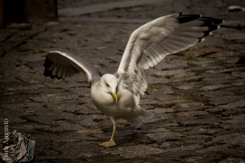 Mas a vida acontece lá fora. Um dia destes, de manhã, encontrei esta gaivota. Juntou-se com um grupo de pombas e com dificuldade disputava com elas restos de comida, embrulhada em jornal, que a dona do café atirava para a rua. Não se afastaram nem um pouco quando me aproximei. Fui fotografando. Já tinha reparado na falta de equilíbrio da gaivota, mas só quando olhei pela objetiva, aproximei o olhar e vi, é que percebi porquê. Enchi-me de compaixão. Não consigo editar as fotografias sem voltar a senti-la. Tenho procurado pela gaivota mas nunca mais a vi. Talvez um dia volte a encontrá-la, com aquelas asas imensas e luminosas por entre o cinzento das pombas e as pedras molhadas da calçada, com aqueles olhos que me fitaram, por entre medo e pena.